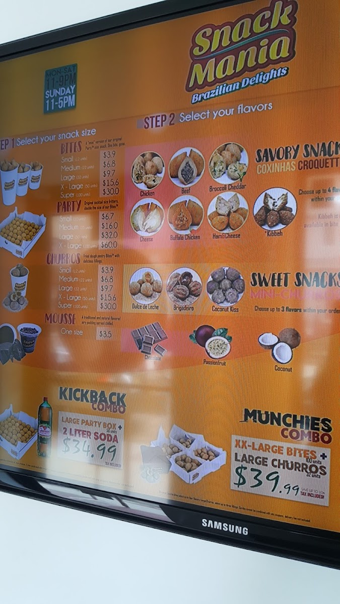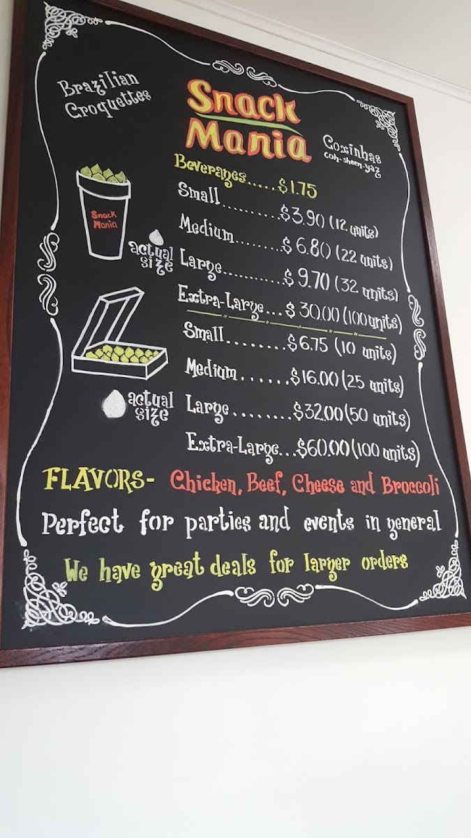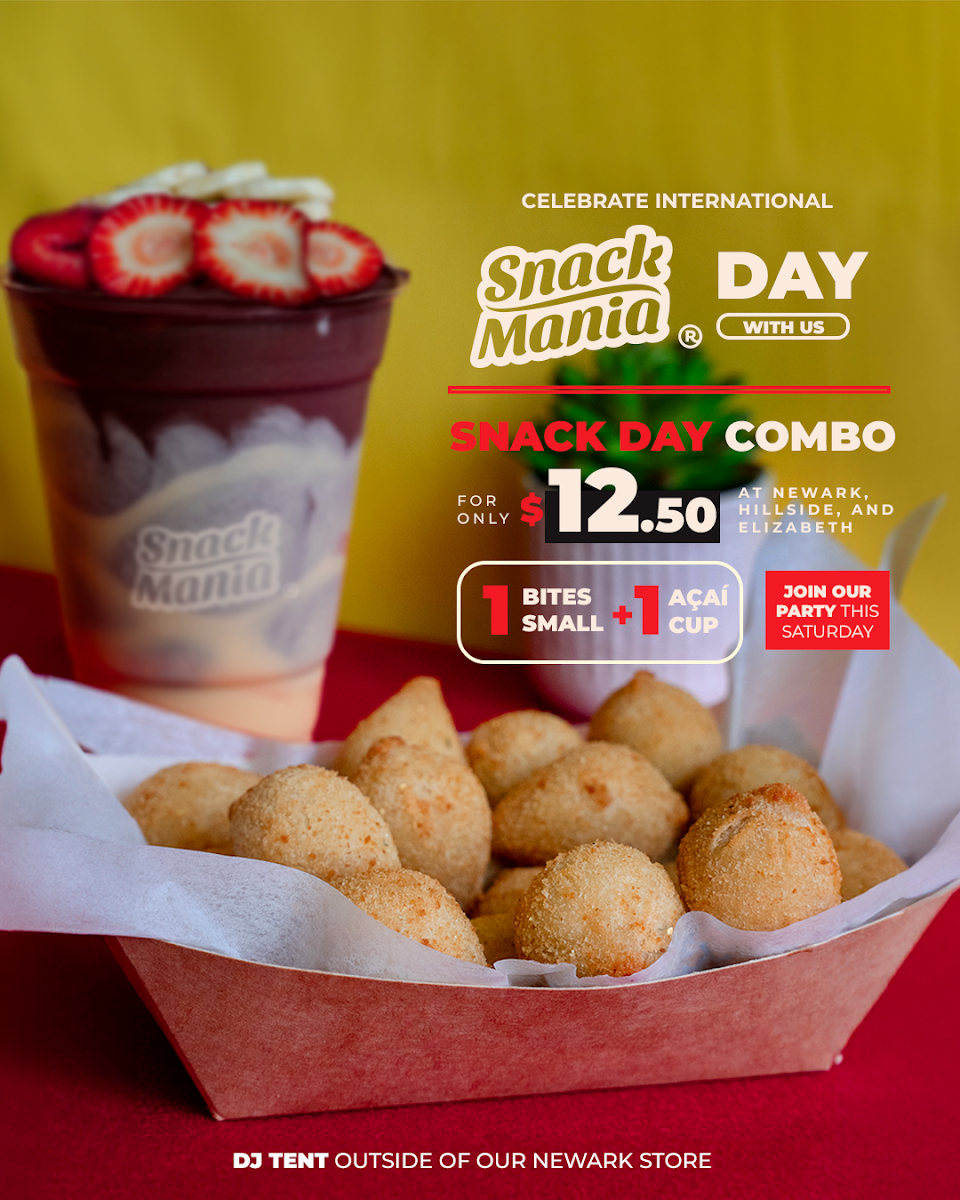 The menu at Snack Mania in Elizabeth, NJ offers a diverse selection of delicious snacks and drinks that cater to a variety of tastes. For drinks, you can choose from popular options like Red Bull, Schweppes Ginger Ale, Sprite, Poland Spring Bottled Water, and Coca-Cola. If you’re in the mood for something sweet, the frozen snacks section includes Chicken Empadao Pie and Churro Bites, each priced to suit different budgets. There are also options like Pão De Queijo and Party bites, all frozen and ready to be enjoyed. The Açaí menu features refreshing options like the Açaí Bowl and Açaí Cup for those craving a healthy treat. For savory cravings, the bite-sized offerings are impressive, with choices like Large Bites (50), Small Bites (15), and the hearty Super Bites (100). Traditional snacks include favorites such as Pastel, Brazilian Cassava Pie, Coxinha, and Kibbeh Croquette, offering a delicious taste of Brazilian cuisine. Gourmet desserts are also a highlight, with indulgent treats like Brazilian Cookie Fudge, Mousse, Mini-Pudim, and the sweet Gourmet Brigadeiro. If you're hosting a gathering, Snack Mania's party-sized options, including the Super Party (100) and Large Party (50), are perfect for any event. The cake selection includes favorites like Coconut Cloud Cake, Mini Carrot Cake, and the ever-popular Tres Leches. Finally, Snack Mania offers tempting combos such as the Kickback Combo, Perfect Combo, and the Pastel & Chill Combo, ensuring there's something for every appetite. With such a wide variety of snacks and desserts, Snack Mania delivers a flavorful experience for every occasion.