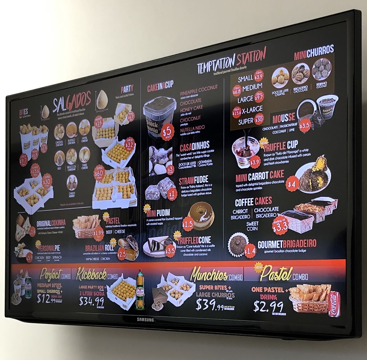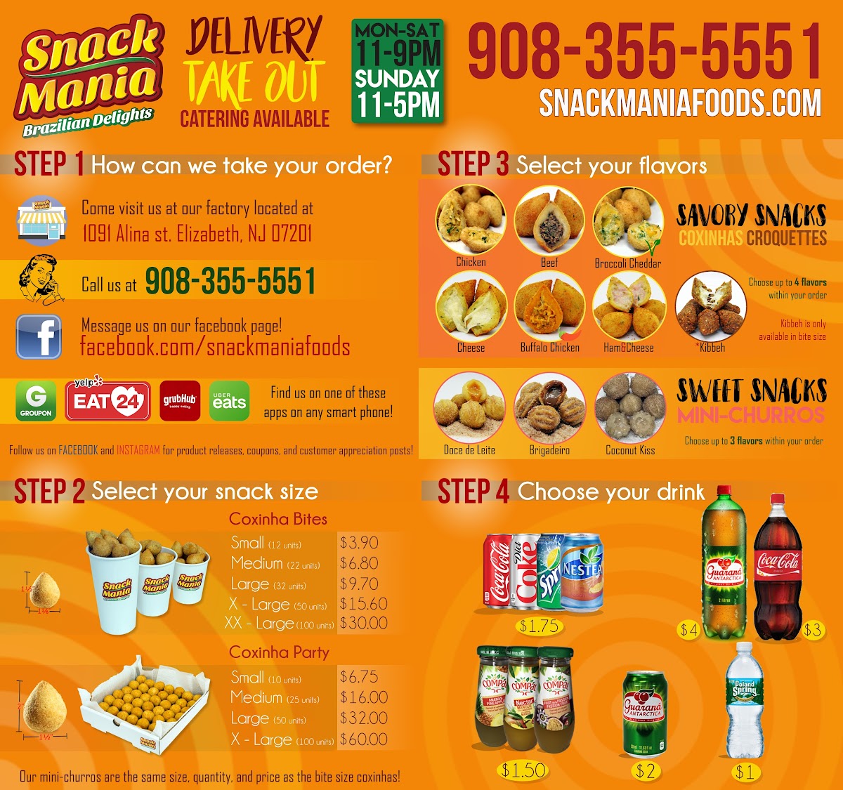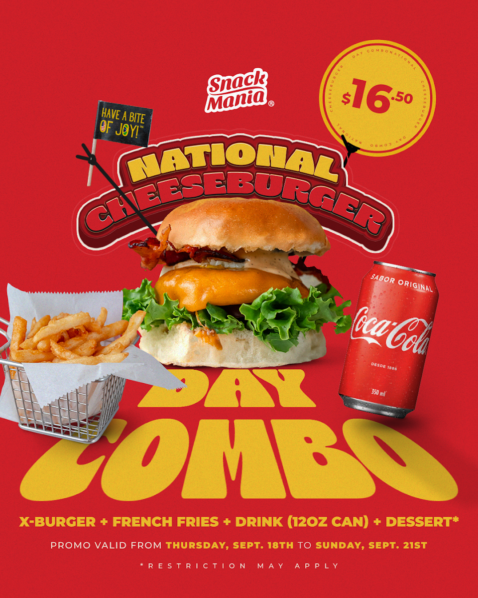The menu at Snack Mania in Elizabeth, NJ offers a diverse selection of delicious snacks and drinks that cater to a variety of tastes. For drinks, you can choose from popular options like Red Bull, Schweppes Ginger Ale, Sprite, Poland Spring Bottled Water, and Coca-Cola. If you’re in the mood for something sweet, the frozen snacks section includes Chicken Empadao Pie and Churro Bites, each priced to suit different budgets. There are also options like Pão De Queijo and Party bites, all frozen and ready to be enjoyed. The Açaí menu features refreshing options like the Açaí Bowl and Açaí Cup for those craving a healthy treat. For savory cravings, the bite-sized offerings are impressive, with choices like Large Bites (50), Small Bites (15), and the hearty Super Bites (100). Traditional snacks include favorites such as Pastel, Brazilian Cassava Pie, Coxinha, and Kibbeh Croquette, offering a delicious taste of Brazilian cuisine. Gourmet desserts are also a highlight, with indulgent treats like Brazilian Cookie Fudge, Mousse, Mini-Pudim, and the sweet Gourmet Brigadeiro. If you're hosting a gathering, Snack Mania's party-sized options, including the Super Party (100) and Large Party (50), are perfect for any event. The cake selection includes favorites like Coconut Cloud Cake, Mini Carrot Cake, and the ever-popular Tres Leches. Finally, Snack Mania offers tempting combos such as the Kickback Combo, Perfect Combo, and the Pastel & Chill Combo, ensuring there's something for every appetite. With such a wide variety of snacks and desserts, Snack Mania delivers a flavorful experience for every occasion.